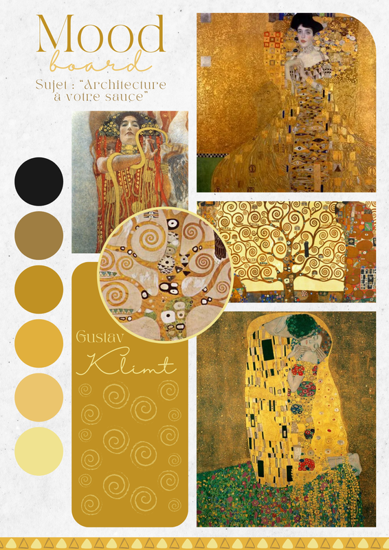 J'aime l'univers et l'identité visuelle de Klimt. Je vais donc m'inspirer de ses formes et couleurs pour créer l'architecture et les détails du décor.